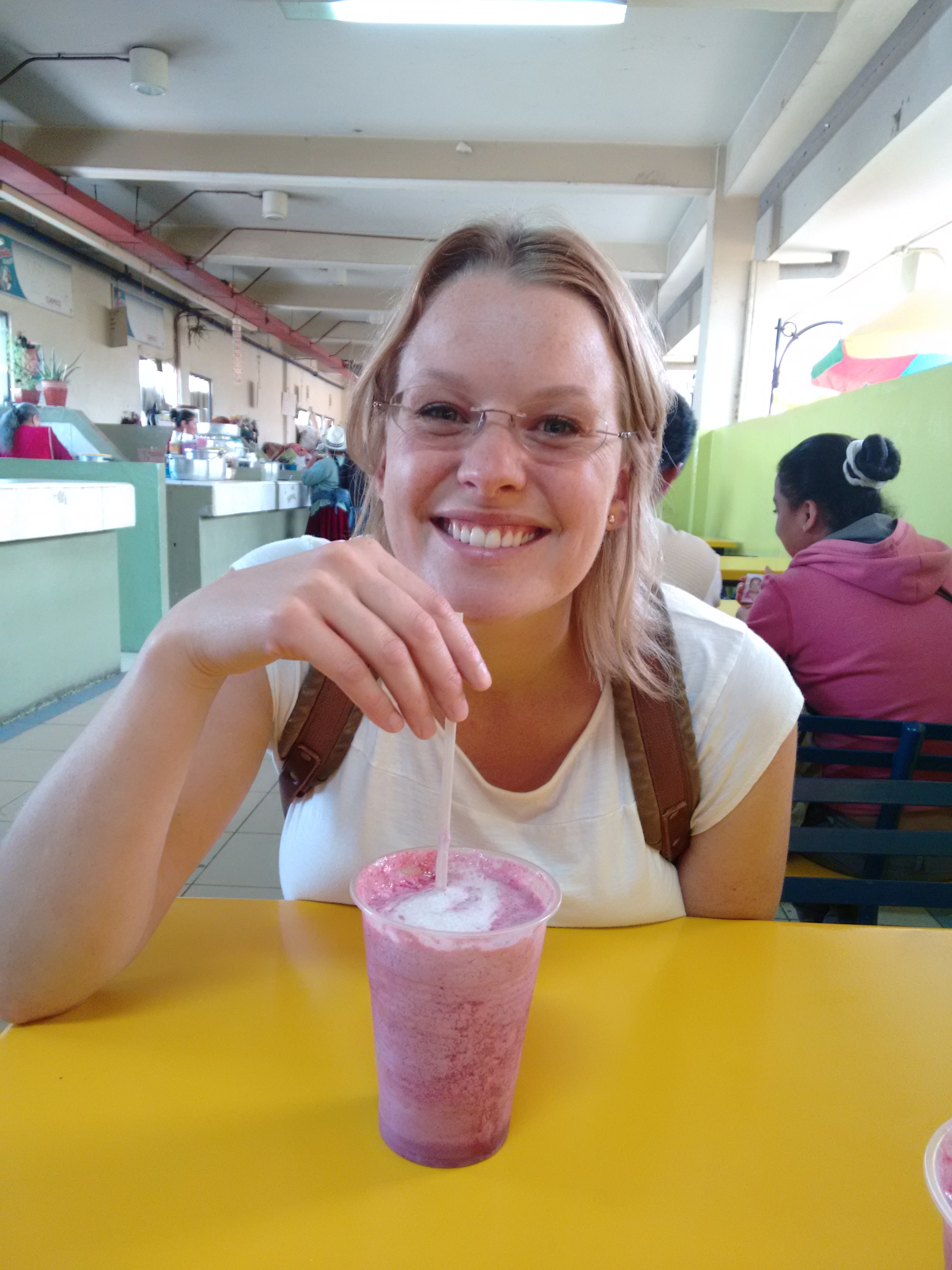 Inside the market with a fresh strawberry shake