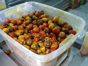 While on our tour, we learned that the most common use of fruit in Colombia (and in many South American countries) is to make juice. There are many fruits that are not especially sweet, but once they are drained and A LOT of sugar has been added, they make excellent juice. Colombians have a big sweet tooth so the sweeter, the better. Below are several examples of these fairly tart fruits before they are made into juice.