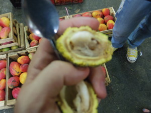 The most interesting fruit to me (or at least the one which was the most fun to eat) was called a mamoncillo (Spanish lime). About the size of a very small lime, you have to first bite through the skin which is surprisingly thin. Once you do this, the whole fruit snaps apart and a slimy ball with a large pit pops out. You eat this fruit by chewing on the little bits of flesh around the rubbery pit. It was sweet but mostly a lot of fun.